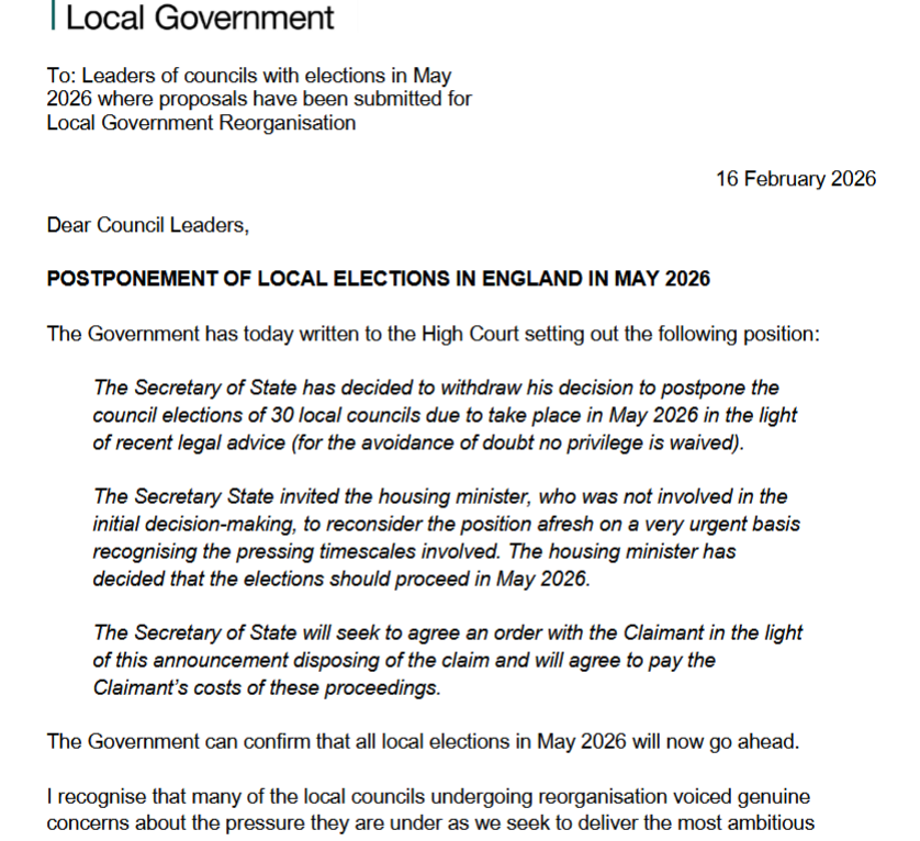 The Secretary of State has decided to withdraw his decision to postpone the council elections of 30 local councils due to take place in May 2026 in the light of recent legal advice (for the avoidance of doubt no privilege is waived).